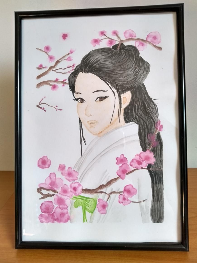 Aquarelle originale fille japonaise et fleurs de cerisier