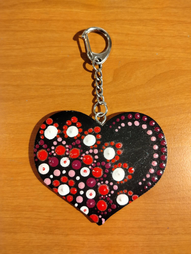 Ce porte-clés mandala est composé d’une pièce de bois en forme de cœur. Il est peint à la main avec de la peinture acrylique. Il s’agit d’une pièce unique. Du vernis a été appliqué afin de protéger le dessin.